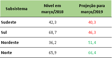 Na última sexta-feira (22/03/2019), o ONS divulgou a previsão de níveis de armazenamento para final de março/2019, onde apresentou projeções de níveis de armazenamento de 51,4 % para o Nordeste.