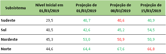Na última sexta-feira (15/03/2019), o ONS divulgou a previsão de níveis de armazenamento para final de março/2019, onde apresentou aumento nas projeções do Sul e Sudeste. Enquanto isso, a região Nordeste manteve a previsão de níveis anterior, e o Norte sofreu decréscimo nas projeções.