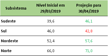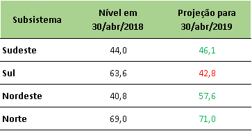 Na última quinta-feira (18/04/2019), o ONS divulgou a previsão de níveis de armazenamento para final de abril/2019, onde aumentou a previsão da última semana para todos os subsistemas.