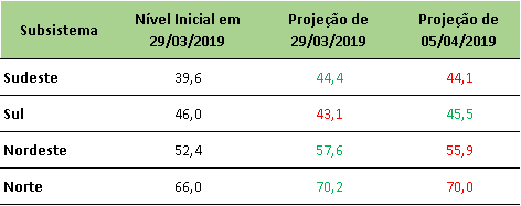 Na última sexta-feira (05/04/2019), o ONS divulgou a previsão de níveis de armazenamento para final de abril/2019, onde reduziu a previsão anterior para o Sudeste, Nordeste e Norte do país. Já para o subsistema Sul houve aumento na previsão de armazenamento.