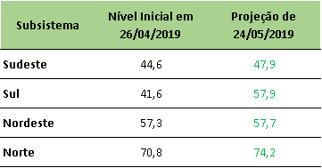 Na última sexta-feira (24/05/2019), o ONS divulgou a previsão de níveis de armazenamento para final de maio/2019, onde apresentou aumento na projeção de níveis em todos os subsistemas, com destaque para o Sul e Sudeste do país.