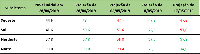 Na última sexta-feira (17/05/2019), o ONS divulgou a previsão de níveis de armazenamento para final de maio/2019, onde apresentou redução na projeção de níveis no Sul e Sudeste do país.