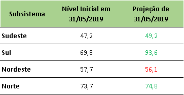 Na última sexta-feira (31/05/2019), o ONS divulgou a previsão de níveis de armazenamento para final de junho/2019, onde apresentou continuação no aumento dos níveis até final de junho/2019 para os subsistemas Sul, Sudeste/Centro-oeste e Norte.