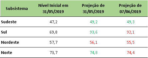 Na última sexta-feira (07/06/2019), o ONS divulgou a previsão de níveis de armazenamento para final de junho/2019, onde apresentou redução nas projeções da semana anterior para Sul, Nordeste e Norte do país.