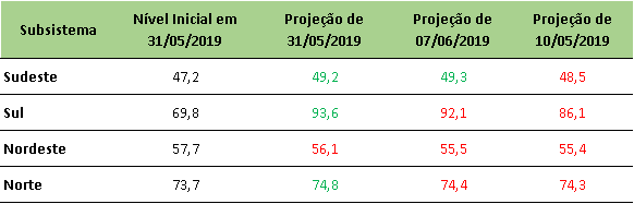 Na última sexta-feira (14/06/2019), o ONS divulgou a previsão de níveis de armazenamento para final de junho/2019, onde apresentou redução na projeção para todos os subsistemas.