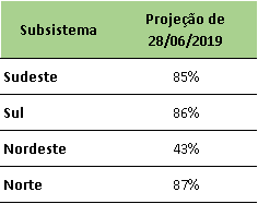 O ONS divulgou projeção de Energia Natural Afluente para o final de julho/2019, onde indicou chuvas abaixo da média para todos os submercados.