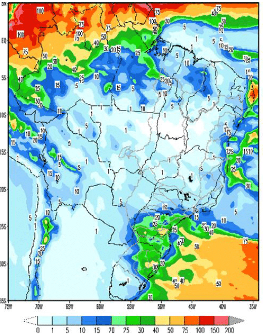Historicamente o mês de julho já possui pouca quantidade de chuvas em valores absolutos em grande parte do país, com exceção da região Sul.