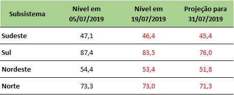 Na última sexta-feira (19/07/2019), o ONS divulgou redução nos níveis de armazenamento em todos os submercados.