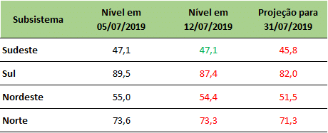 Na última sexta-feira (12/07/2019), o ONS divulgou a redução nos níveis de armazenamento em todos os submercados.