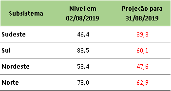 Na última sexta-feira (02/08/2019), o ONS divulgou redução nos níveis de armazenamento em todos os submercados. A previsão indica continuação da queda nos níveis até final de agosto/2019.