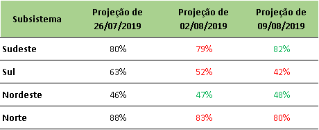O ONS divulgou na última sexta-feira (09/08/2019) projeção de Energia Natural Afluente – ENA redução na previsão de chuvas no Sul e Norte do país, onde todos os submercados deverão ter chuvas abaixo da média histórica.
