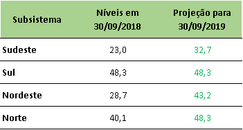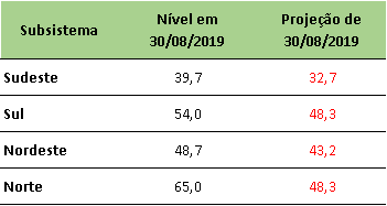 Na última sexta-feira (30/08/2019), o ONS divulgou a projeção de níveis de armazenamento para final de setembro/2019, onde apresentou a continuação de queda durante todo o período.
