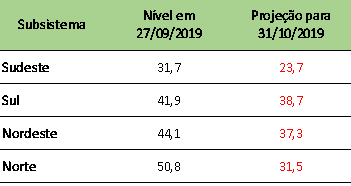 Na última sexta-feira (27/09/2019), o ONS divulgou a projeção de níveis de armazenamento para final de outubro/2019.
