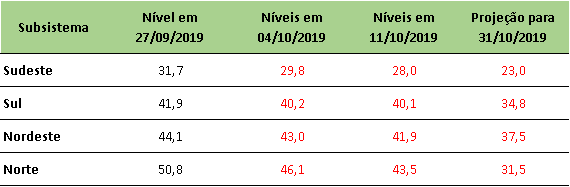 Na última sexta-feira (11/10/2019), o ONS divulgou a projeção de níveis de armazenamento para final de outubro/2019.