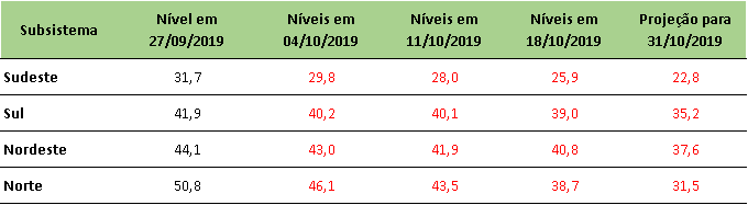 Na última sexta-feira (18/10/2019), o ONS divulgou a projeção de níveis de armazenamento para final de outubro/2019.