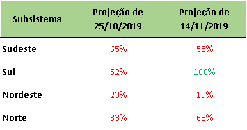 Haverá aumento de chuvas nas próximas semanas no SE e CO do país, porém em relação a semanas anteriores, há previsão de redução na Energia Natural Afluente – ENA mensal de novembro/2019.