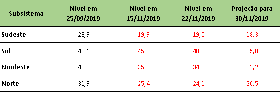 Na última quinta-feira (22/11/2019), o ONS divulgou a projeção de níveis de armazenamento para final de novembro/2019, onde indicou que os níveis devem continuar caindo até final do mês.