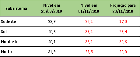 Na última sexta-feira (01/11/2019), o ONS divulgou a projeção de níveis de armazenamento para final de novembro/2019, onde indicou que os níveis devem continuar caindo até final do mês.