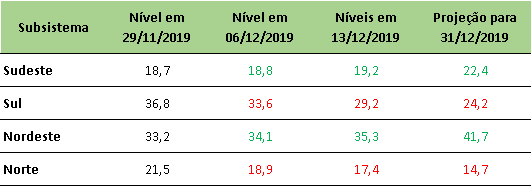 Na última sexta-feira (13/12/2019), o ONS divulgou a projeção de níveis de armazenamento para final de dezembro/2019, onde apresentou aumento nos níveis dos reservatórios para Sudeste e Nordeste do país.