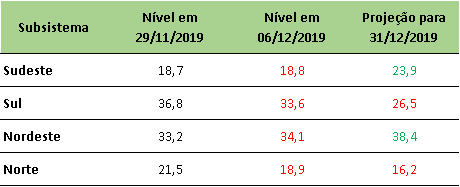 Na última sexta-feira (06/12/2019), o ONS divulgou a projeção de níveis de armazenamento para final de dezembro/2019, onde apresentou queda nos reservatórios do Norte e Sul do país, e com recuperação do armazenamento no Sudeste e Nordeste.
