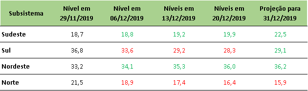 Na última sexta-feira (20/12/2019), o ONS divulgou a projeção de níveis de armazenamento para final de dezembro/2019, onde apresentou aumento nos níveis dos reservatórios para Sudeste, Nordeste e Sul do país.