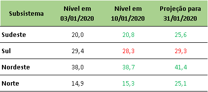 Na última sexta-feira (10/01/2020), o ONS divulgou a projeção de níveis de armazenamento para final de janeiro/2020, onde apresentou aumento em relação aos dados da semana passada.
