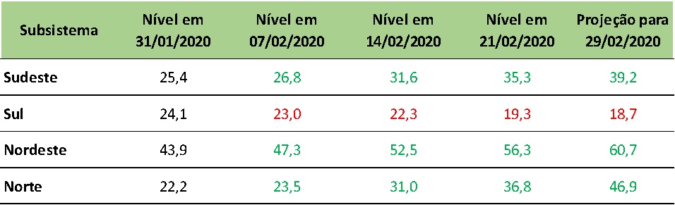 Na última sexta-feira (21/02/2020), o ONS divulgou a projeção de níveis de armazenamento para final de fevereiro/2020, onde apresentou aumento nos reservatórios em praticamente todos os submercados, com exceção do subsistema Sul.