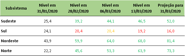 Na última sexta-feira (13/03/2020), o ONS divulgou a projeção de níveis de armazenamento para final de março/2020, onde apresentou aumento significativo nos níveis dos reservatórios durante o mês, com exceção para o submercado Sul que está em situação crítica.