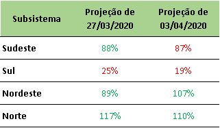 O ONS divulgou na última sexta-feira (03/04/2020) a projeção de Energia Natural Afluente – ENA para abril/2020, onde apresentou pouca chuva no Sul e volumes próximos da média nos demais subsistemas.