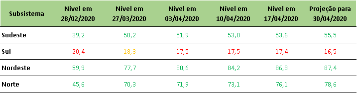 Na última sexta-feira (10/04/2020), o ONS divulgou a projeção de níveis de armazenamento para final de abril/2020.
