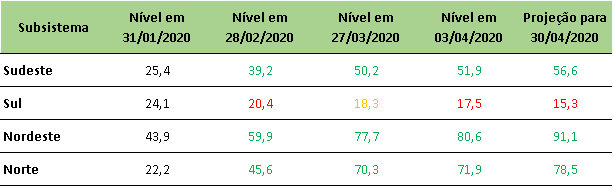 Na última sexta-feira (03/04/2020), o ONS divulgou a projeção de níveis de armazenamento para final de abril/2020.