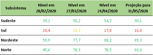 Na última sexta-feira (24/04/2020), o ONS divulgou a projeção de níveis de armazenamento para final de maio/2020.