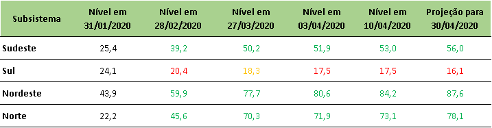 Na última sexta-feira (10/04/2020), o ONS divulgou a projeção de níveis de armazenamento para final de abril/2020.