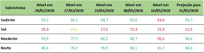 Na última sexta-feira (16/05/2020), o ONS divulgou a projeção de níveis de armazenamento para final de maio/2020, onde apresentou pequena queda nos níveis de armazenamento em grande parte do país.