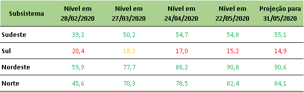 Na última sexta-feira (22/05/2020), o ONS divulgou a projeção de níveis de armazenamento para final de maio/2020, onde manteve a previsão de queda de reservatórios no Sul do país.
