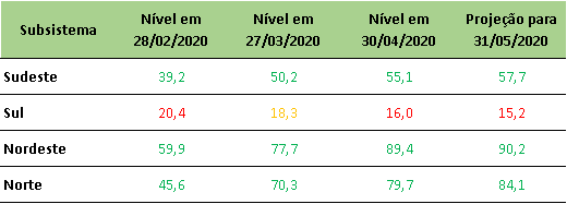 Na última quinta-feira (30/04/2020), o ONS divulgou a projeção de níveis de armazenamento para final de maio/2020.