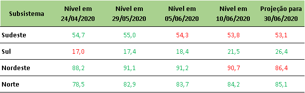 Na última quarta-feira (15/06/2020), o ONS divulgou aumento nos níveis de armazenamento no Sul e Norte do país. A projeção indica que os níveis continuem aumentando até final de junho/2020.