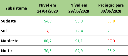 Na última sexta-feira (29/05/2020), o ONS divulgou a projeção de níveis de armazenamento para final de junho/2020, onde apresentou aumento nos reservatórios do Sul e Norte do país.