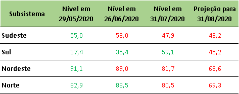 Na última sexta-feira (31/07/2020), o ONS divulgou projeções de níveis para o final de agosto/2020, onde apresentou queda em todos os subsistemas do SIN.