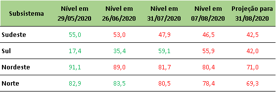 Na última sexta-feira (07/082020), o ONS divulgou projeções de níveis para o final de agosto/2020, onde apresentou queda nos níveis dos reservatórios de todos os subsistemas na última semana, com projeção de redução acentuada até 31/08/2020.