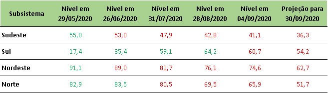 Na última sexta-feira (04/09/2020), o ONS divulgou a projeção de níveis para o final de setembro/2020, apresentando redução de níveis em todos os submercados, com destaques para o Sul e Norte do país.
