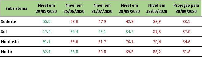 Na última sexta-feira (18/09/2020), o ONS atualizou a projeção de níveis para o final de setembro/2020, onde divulgou queda nos valores em relação à última semana.