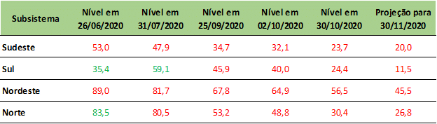 O Operador Nacional do Sistema – ONS divulgou na última sexta-feira (30/10/2020) projeção de níveis de armazenamento para final de novembro/2020, onde mesmo com o aumento de volume de chuvas projeta queda nos níveis de armazenamento em todo o país.