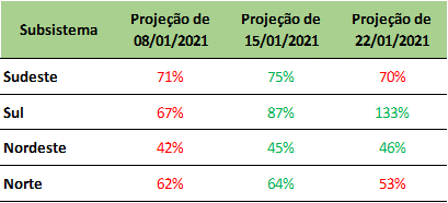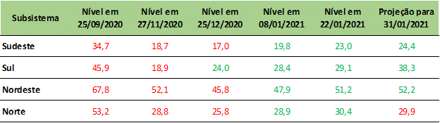 Previsão de níveis de armazenamento para final de janeiro/2021 (%)