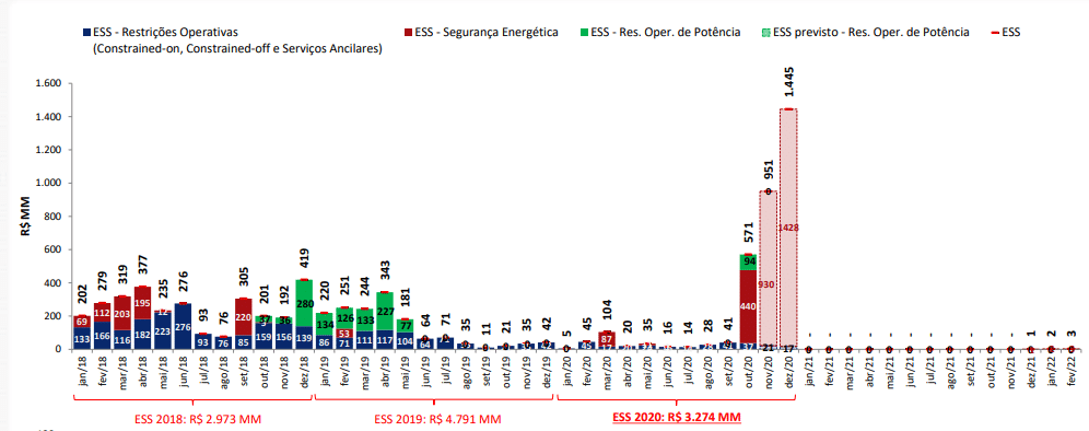 Os Encargos de Serviço do Sistema – ESS da contabilização de dezembro/2020 ficaram superiores à 72x à média do período de out/19 à set/20. Este aumento se deve principalmente pelo acionamento das usinas termelétricas fora da ordem de mérito realizado durante o mês, bem como a importação de energia elétrica sem substituição por fonte termelétrica e o descolamento entre o Preço de Liquidação das Diferenças – PLD e o Custo Marginal de Operação – CMO.