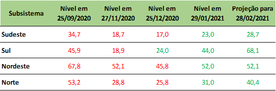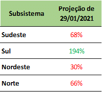 Previsão de níveis de armazenamento para final de janeiro/2021 (%)