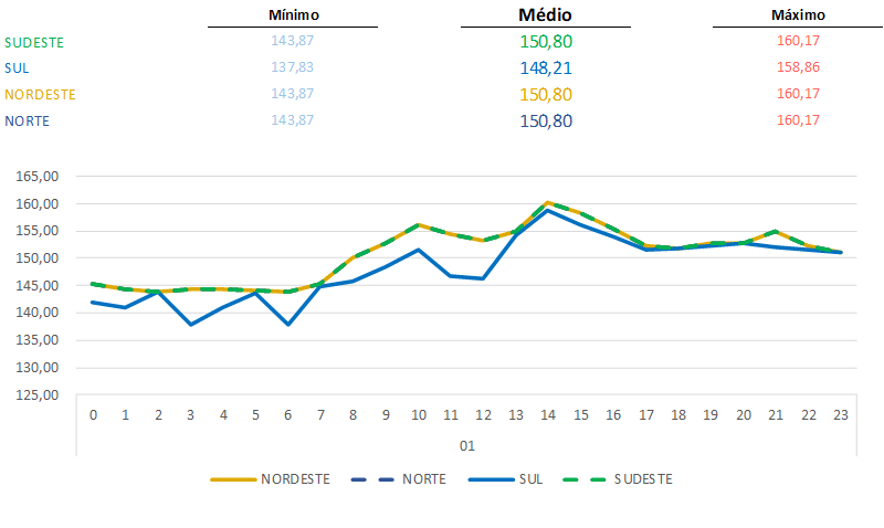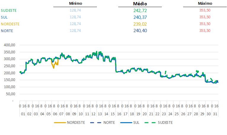 Os preços caíram bastante ao longo do mês e iniciaram o primeiro dia de fevereiro/2021 na faixa de R$/MWh 150,80.