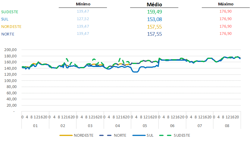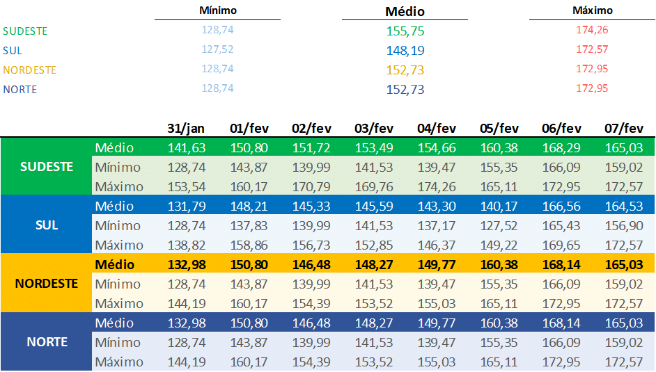 O submercado Sul apresenta descolamento de preços para baixo dos demais submercados em relação à média mensal deste mês (01 à 08/fev).