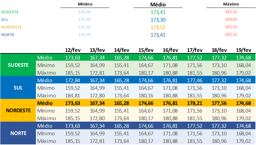 Na última semana, a FCF indicava preços abaixo de R$/MWh 170,00, entretanto na média semanal realizada observou-se preços superiores à R$/MWh 173,00.