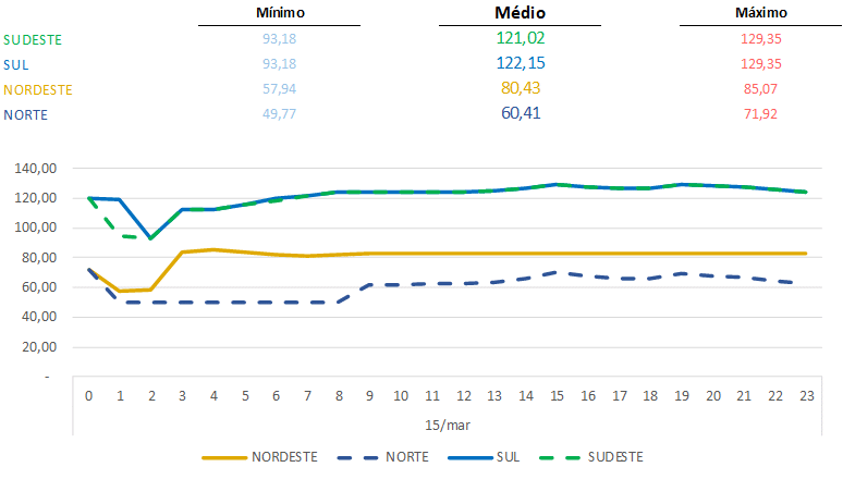Os preços médios nesta primeira quinzena de março/21 estão em aproximadamente R$/MWh 100,00 para Sul e Sudeste, R$/MWh 65,00 para o Nordeste e R$/MWh 58,07 para o Norte.